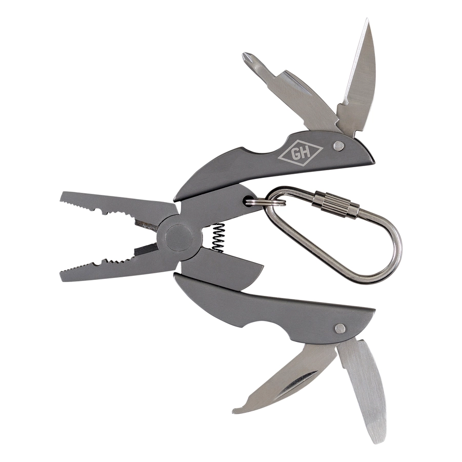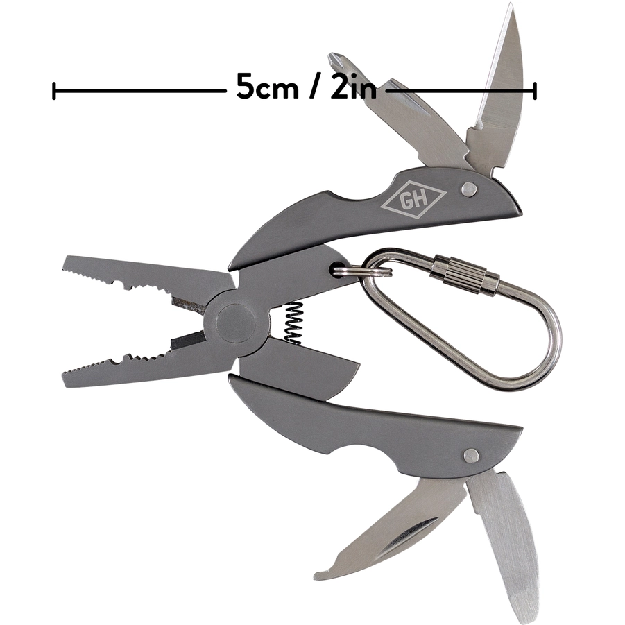 Multi-Tool pliers included screwdriver, bottle opener and saw. Titanium finish. Packaged in an illustrated tin.