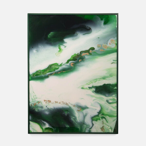 Richly colored paint reacts with flashes of gold during the pouring process, making each piece unique. Green abstract resin